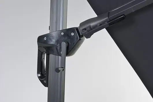 Op zoek naar een luxe zweefparasol? Dan is de Hawaii zweefparasol vierkant 300×300 cm met zijn groot schaduwoppervlak iets voor u. De parasol heeft een carbon black kleurig aluminium frame en mast. De mast heeft een doorsnede van 80 mm en is door de poedercoating makkelijk in onderhoud. De donker grijze 250 gram polyester parasoldoek is voorzien van een PA coating. De parasol kunt u heel makkelijk bedienen door het voetpedaal en het schuifmechanisme met draaihendel.